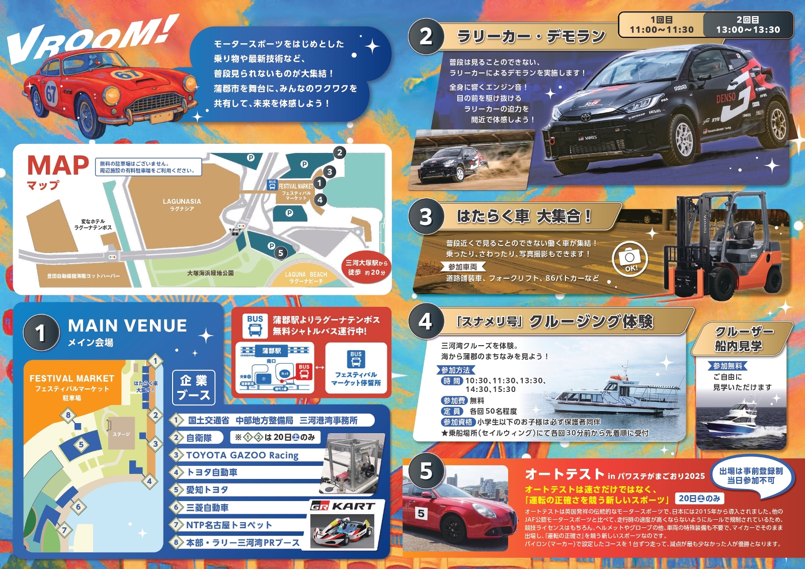 | 主なイベント内容 | (1)スカベンジャーラリー (2)ラリーカーデモ走行(予定) (3)はたらく車大集合! (4)企業ブース、自治体ブース (5)クルージング体験 |
